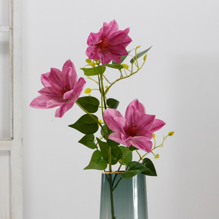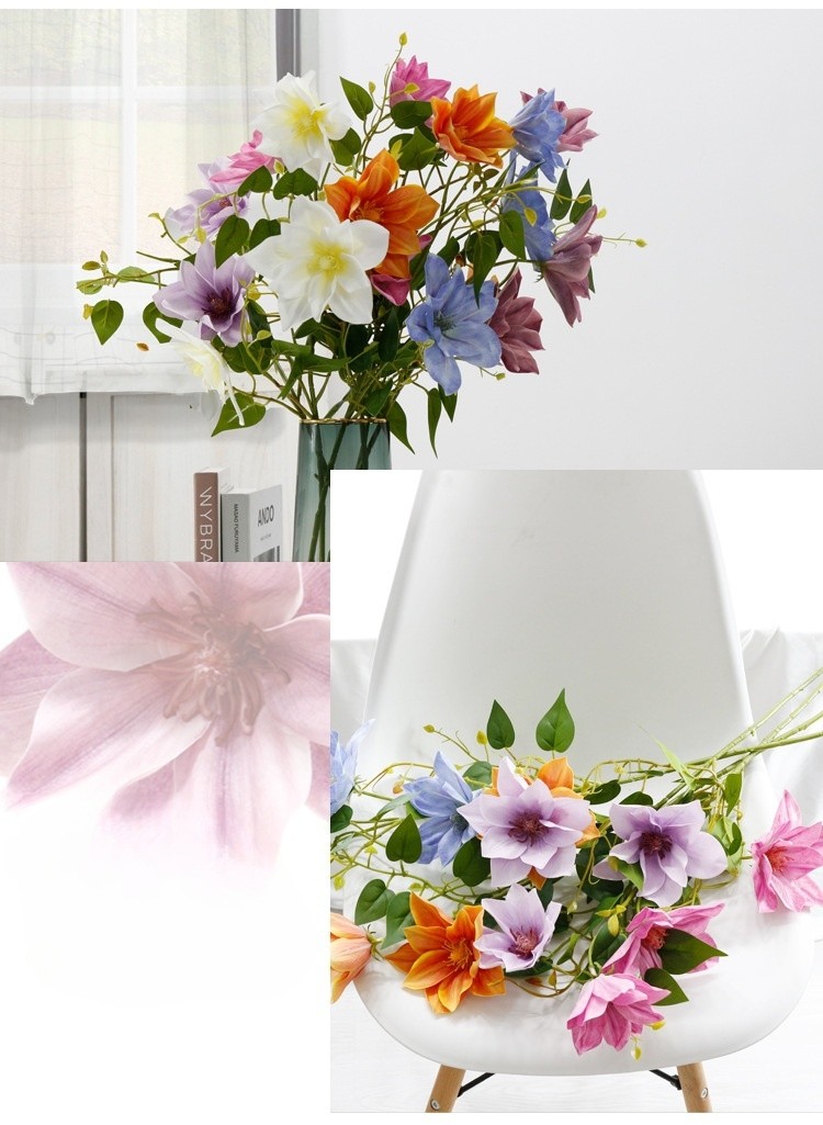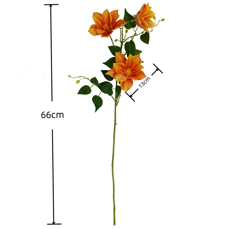 Crafted with exquisite detail, this artificial clematis replica mimics nature’s beauty, offering a soft, realistic texture perfect for tactile appreciation. Each stem measures 66 cm in total length, featuring three lush flower heads with diameters ranging from 10-13 cm. Designed to captivate, its hand-painted petals and flexible wire stems ensure effortless styling.